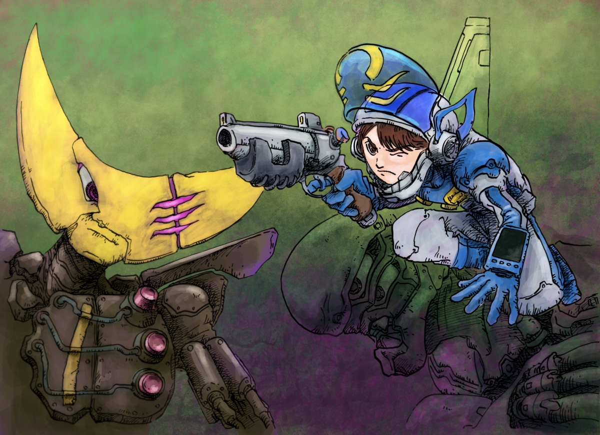 宇宙キッド 宇宙キッド対ジェイルブレイカーズの活躍想像図。20230916 投稿者: murbo 投稿日: 2023/09/172023/09/17 宇宙キッド対ジェイルブレイカーズの活躍想像図。大昔はプラモデルなどの箱絵は活躍想像図と言われていたのでそれに倣いました。宇宙キッドは個人で捜索しているコンテンツです。 三日月頭の怪人は宇宙人でキルスイッチといいます。地球で活動する体を形成するために全身がスイッチで固められています。 紙に筆のドローイングにProcreateで彩色。 関連記事: パフェ怪人 注射怪人 コーヒーメーカー怪人