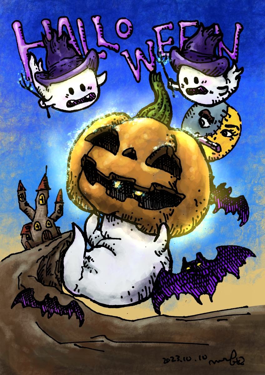 チョークイラストの体験会の参加したときに自分の絵を描けなかったので、チョークイラストを描いた板の裏にマットホップで描いたドローイングにProcreateで塗りました。もうハロウィンはいいだろう。飽きてきた。