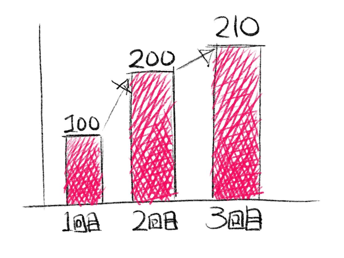 問題は三回目の微増です。実数は右上がりですが、伸び率は下がっています。四回目はテコ入れをしなくてはいけない危機的状況なのです。その他のデータからリピーターが多ければ常連に対するサービスや常連になってもらう仕掛けを考え、有料であれば価格は据え置きか値上げしても問題ないかとか、新規の方が多ければイベントをマニア向けより入門的なコンテンツを増やして間口を広げるとか、有料の場合は価格の見直しなどこう思慮なければならない、相当深刻な状況なのです。