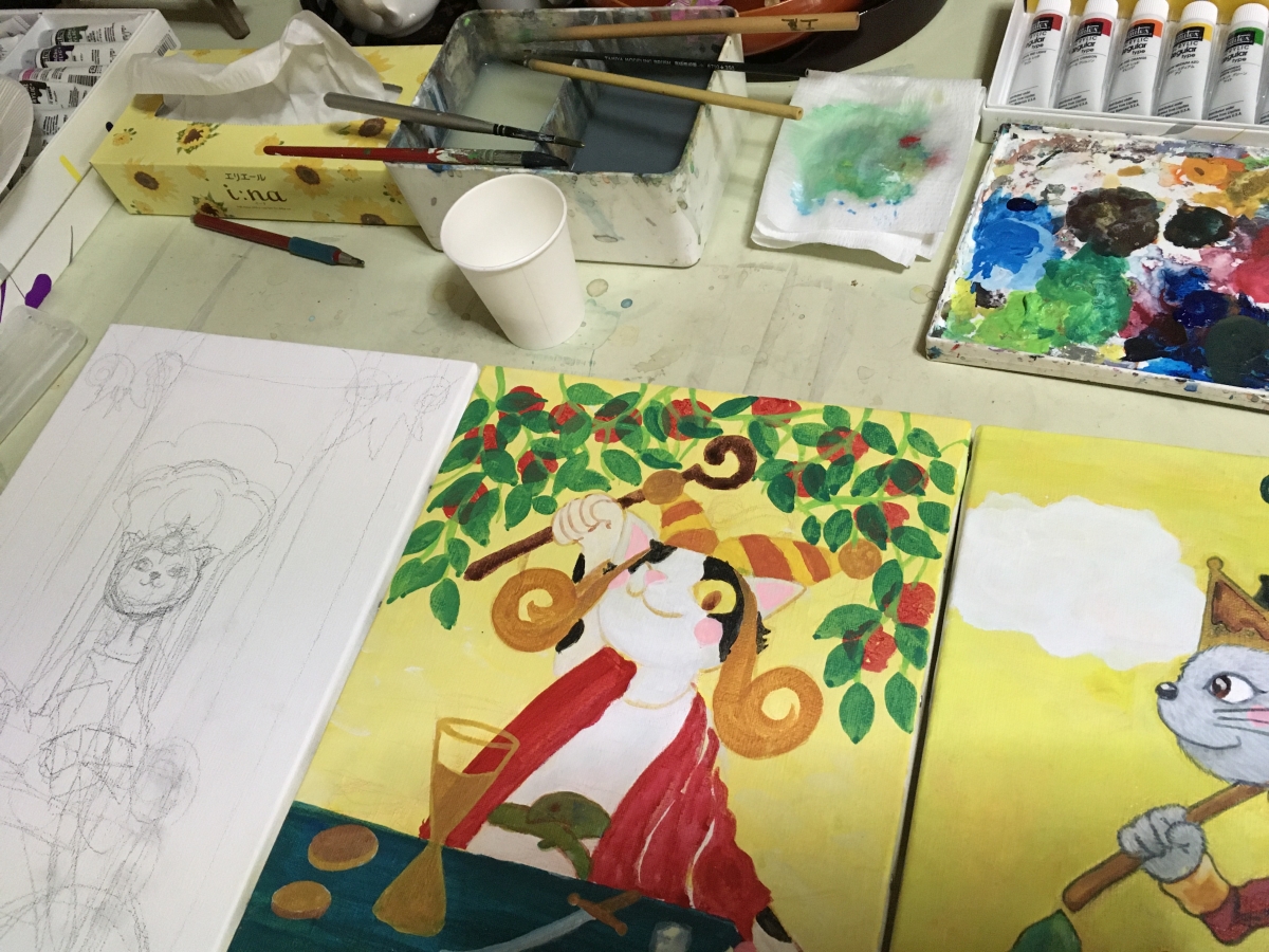 まあぼん まあぼんのタロットカード制作210304 投稿者: murbo 投稿日: 2021/03/052021/10/26 二人で描いているだけでなく、作業効率の問題もあって複数枚を同時に描いています。 結構進んでいるように見える。完成にはまだまだ遠いよ。ちょっとメイキング的なことを書きます。この見た目の塗っている状態の前に全体のラフスケッチを二枚作って相談、部分のスケッチなどをしてからキャンバスにあたりを鉛筆で取り、筆でかんたんな線画を描いています。青っぽい方はまだ線画が見えていますが、最終的にこの線は消えます。隣はもうちょっと葉っぱ増やさないとスカスカに見えるね。 キャンバスにアクリル絵の具。 関連記事: まあぼん、タロットカード制作210215 まあぼん、タロットカードの制作日。210218 まあぼん、タロットカード210225