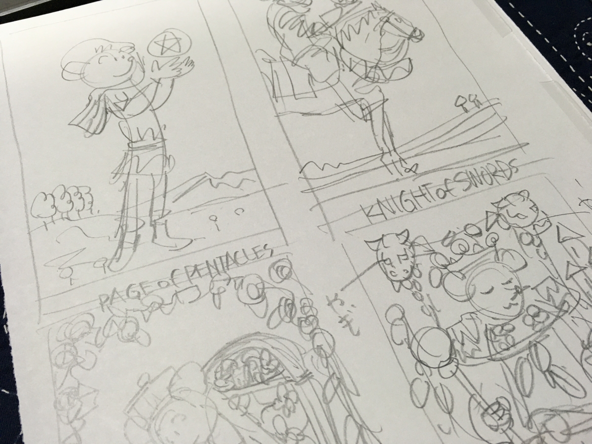 大アルカナも描くことにしました。しかし小アルカナと同じように描くととても先が長いので、写真のL判サイズでモノクロドローイングで制作します。感覚としては小アルカナのおまけです。今回は全56枚のスケッチを起こしました。