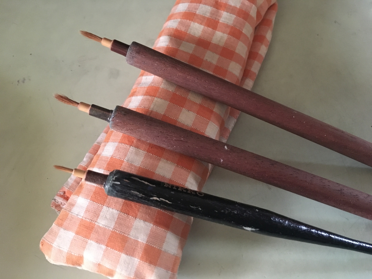 面相筆の軸が細いことを誰も問題にしないので気にならないのかと思ったら最近の面相筆的なものは持ち手の部分が太くなっているものもあるようですね。僕はまだ在庫があるので、以前からやっている持ち手の部分を丸棒を切り出したものに変えています。かつて作ったものはしっかり穴を開けていなかったので固定部分に難がありましたが、リューターで穴あけしたので今度はしっかり接続と接着が出来ています。手前の黒いのは丸ペン用のペン軸です。たまたま手元にあったので流用しています。