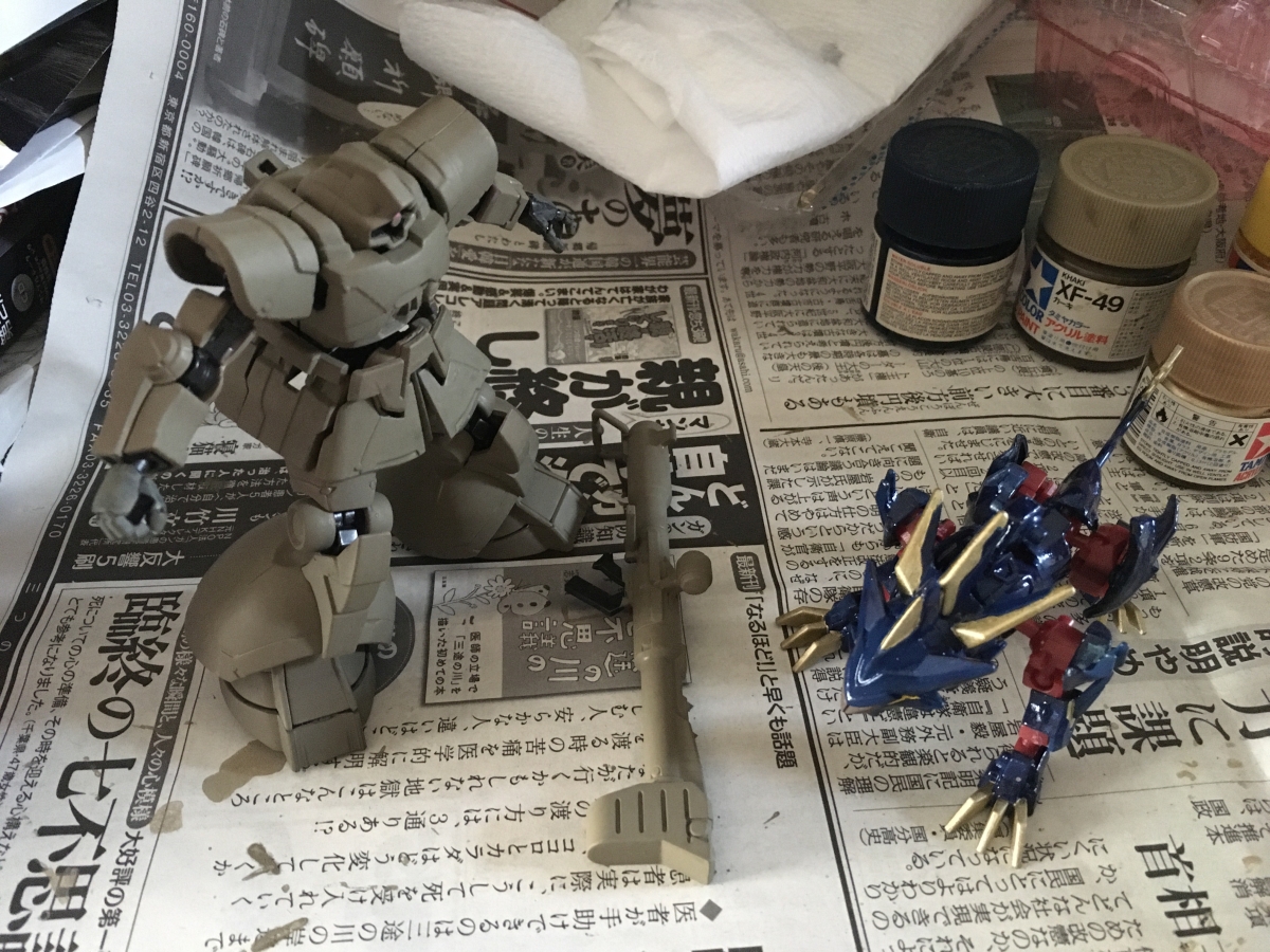 ザクやガンダムの失敗を糧に一旦ばらして外装だけ塗装しています。可動フレームは塗装しないです。カリカリに乾いた感じのつや消しなので見えていなかったディティールが浮き彫りになりました。慌てず乾燥させてから塗装を進めます。次は明細の茶色か緑を塗ります。隣はアニマギアのGALEO STRIKER。青色が余っていると思いこんでいたのでメタリックブルーとかロイヤルブルーで塗り始めたのにすでに固まり始めていたのでもたもたの硬さのまま塗ってしまってあまりいい感じじゃない。ロイヤルブルーで一応塗りきりました。ここからアクリル絵の具でタッチをつけようかと思っています。