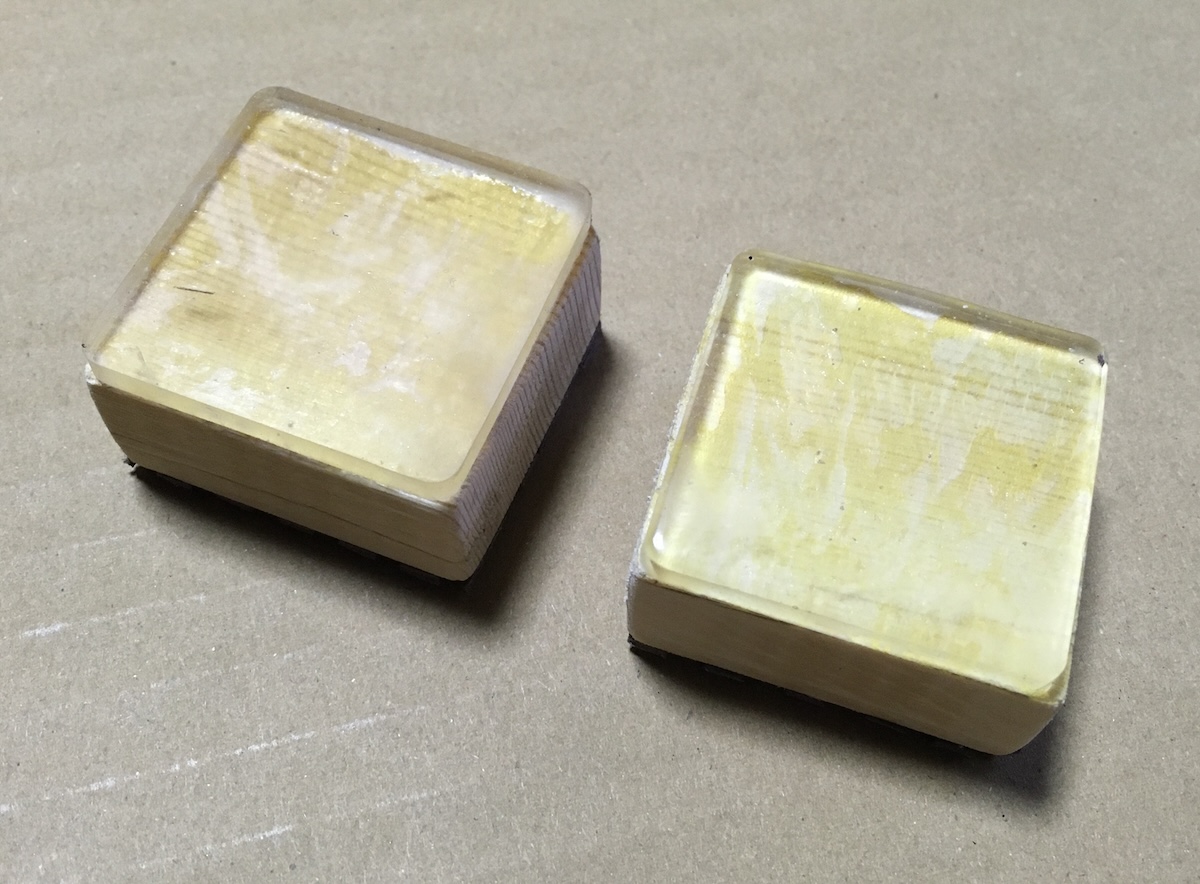 滑り止め側が机に接触する面です。耐震マットを貼ってから木材の整形をしたのでおがくずが満遍なく耐震マットにまぶされ、粘着力は完全になくなりました。あらかた整形できてから軽く水洗いしたので、やや粘着力が戻ってきました。当初は両面とも耐震マットの予定でした。しかし、実際作ってみると片側だけで良いなと思ったので素材を変えました。