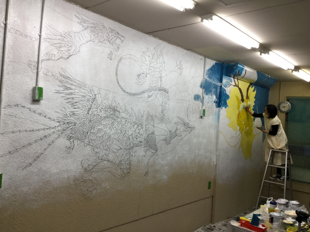 まあぼん 黄龍制作二日目。 投稿者: murbo 投稿日: 2021/08/242022/06/16 制作二日目から色塗りもスタート。もくもく描くのみですが、下地が鉄板(かつてのシャッターボックス)、プラスターボードに水性ペンキ(シャッターをふさいだ部分)、外壁と三種類あるために苦戦しています。毎回苦戦ですね。 下書きは油性マーカーで描いています。ちょっと大きな絵に馴染んでいないせいか描けていない。 Tweets by muarbon 関連記事: 黄龍制作三日目。 黄龍の制作五日目。 黄龍の制作六日目。