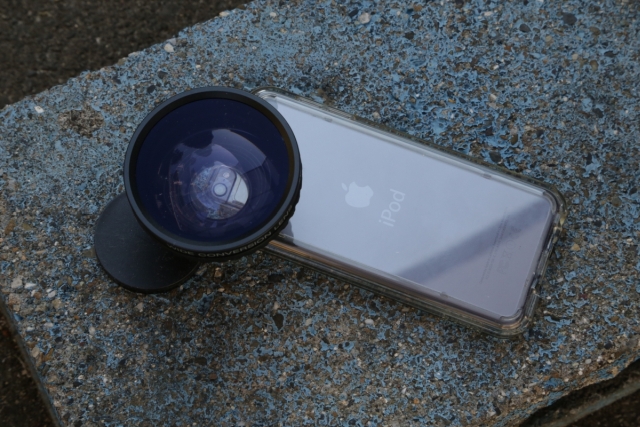 iPod touchに載っているレンズはSONYのDVカメラ用のワイコン(ワイドコンバージョンレンズ)VCL-0637H。2017年11月27日現在だとヤフオクなどで2,000円くらいでおつりがくる模様。
