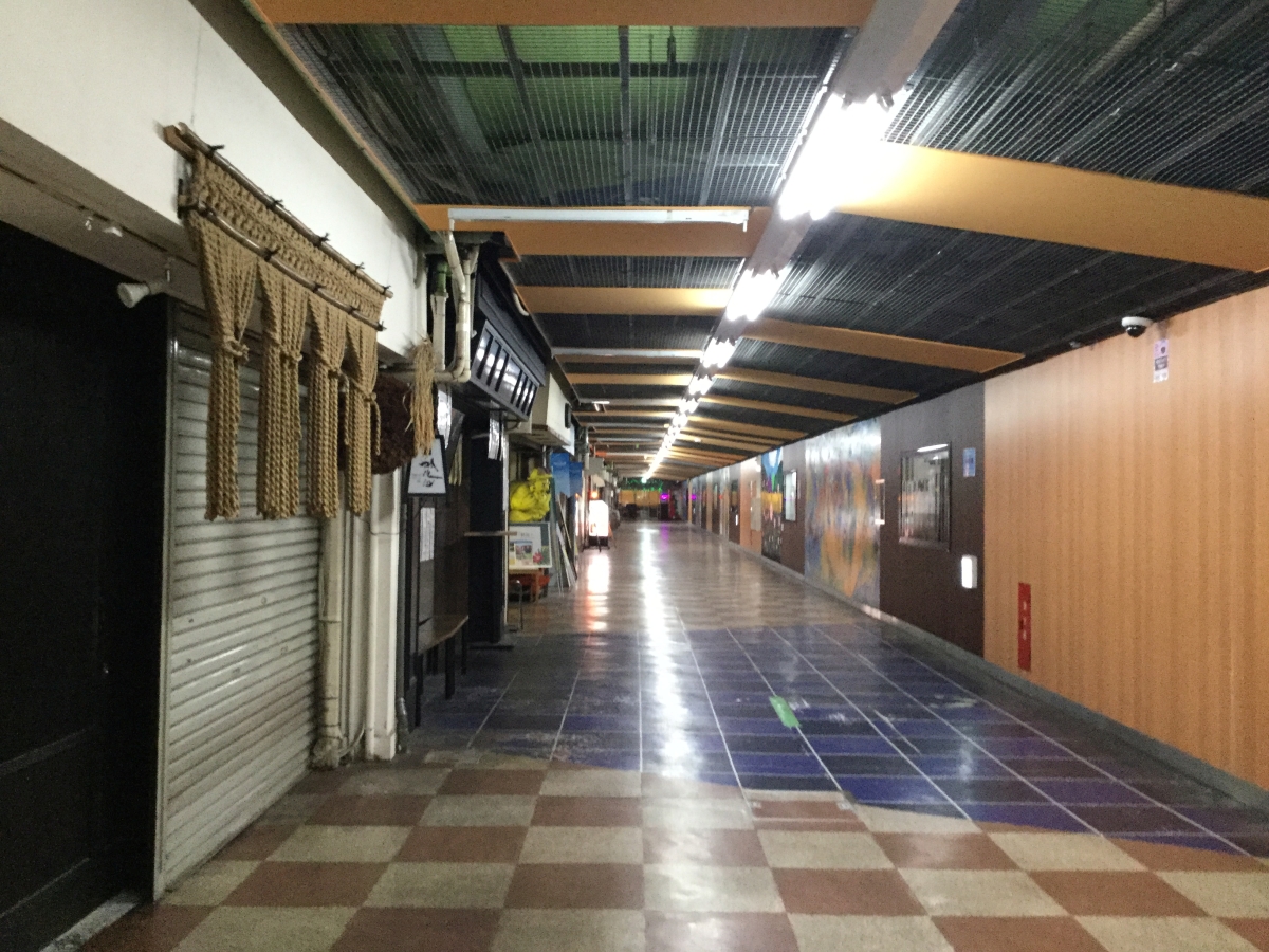 お店はほぼ飲み屋ばかりでしたので賑わうのは夜でしょうか、平日の昼間だったのでほぼ誰もいませんでした。ここは以前夜に来たことがあって、ライブみたいなことをやったりしています。その時はにぎわっていました。とりあえず人の往来があればいいかなと思いました。雰囲気は良いですね。まぁ良いと思ってもらえるように設計されている感じがしました。今、ふしちかアートのページを見たら日曜祝祭日は地下街自体が閉まるようですね。平日だけの開催です。