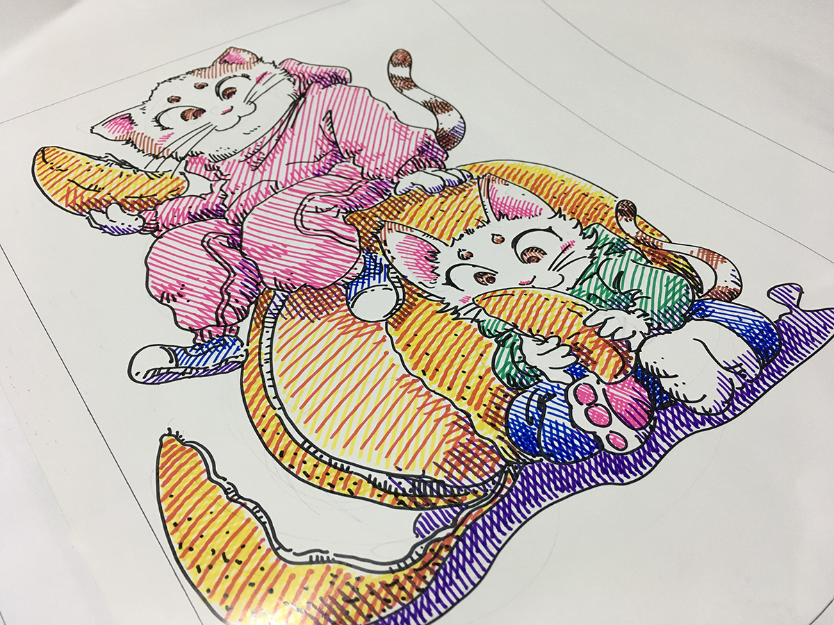 塗り始める。ベタ塗りはうまくいかないだろうし、グラデーションをつけたいのでハッチングにした。黄色がどうしても弱い。