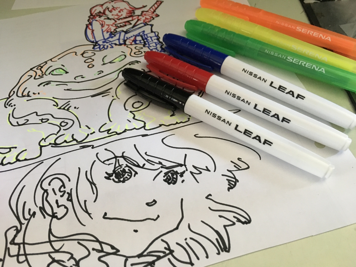 仕事道具 ノベルティのマーカーのお試し。 投稿者: murbo 投稿日: 2022/07/042022/07/04 NISSANでもらったノベルティのマーカー。画材じゃなく、文具。水性染料で軽くて描きやすい。描いているときにその場で止まると自分のインクで滲む。蛍光マーカーは黄色の発色が蛍光らしい感じがする。試し書きは先に蛍光で描いたので蛍光の雰囲気は全く分からなくなっている。形はもちやすいのでこのシリーズでボールペンや顔料インク版とか、そもそも色のバリエーションがあったらいいのにね。 関連記事: マーカーも変更予定。 大きな絵を描く時のマーカー。 マーカーにマーカーを追加する。