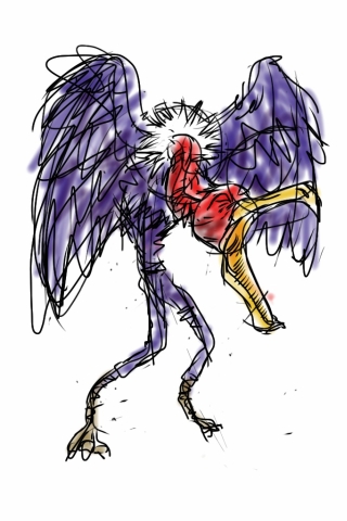 ざっとスケッチしたのがこれ。単にコンドルを人型にあてはめてるだけだなあ。でも人以外の生き物を人サイズにするだけでかなり強力に怖いと思う。