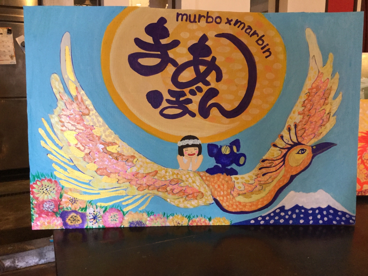 1/20にパジェロの工場のある町、岐阜県坂祝町のロザリエッタというイタリアンでライブドローイングをやりましたよ。まーびんさんとまあぼんというユニットで初仕事です。一緒に描くのも初めてなので本当に初です。上の絵は看板兼練習。原案をまーびんさん、レイアウトを僕が描いて絵はまーびんさんが描きました。一緒に描くこともそうですが、本番のキャンバスにしているプラ段にジェッソで下地の練習でもあります。適当に切り出したまま描いてしまったので上が曲がって切れていますね。
