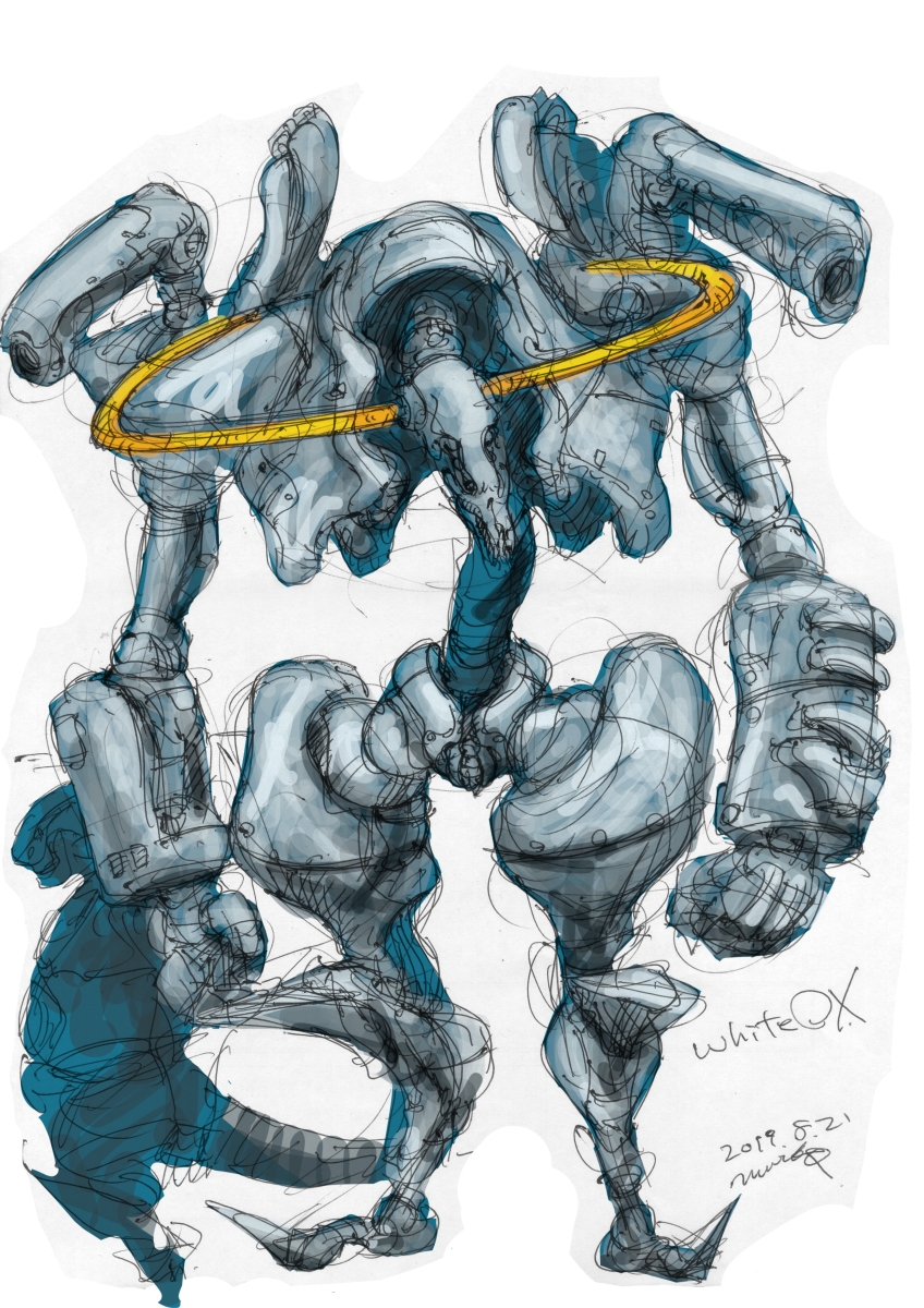 OCTA ORCA WHITE OX 190823 投稿者: murbo 投稿日: 2019/08/232019/08/23 後半の主人公が載るロボット。しかし、コックピットを作るのを忘れた。腰のあたりに乗る予定。肩のキャノン砲をどうしたものか考えるために描いたので他は以前描いたものとぜんぜん違う。 ヒマなくせに全く進められていないので自分に発破かけないとね。 関連記事: OCTA ORCA 6 エビフライ型飛行船171018 GK White