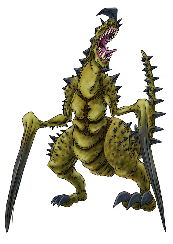 手の大型の詰めも馬の蹄のように指が変化し一体化ような、と言っても馬は指の位置関係が変わっているんだけど、そういった進化をしたとか屁理屈を付けてみる。長野方面で出現する。全長24.3m、体重5.6t。迎撃ロボットはこの腕の大きな角に体を貫通され、パイロットは重傷を負うが、至近距離まで近づいたときにジグジグの両腕を引きちぎり、電子光線砲で頭を破壊し、絶命させた。