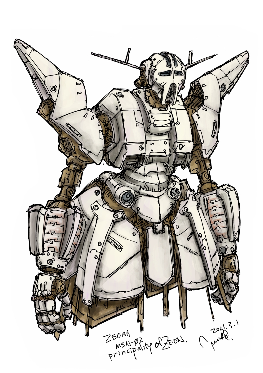 元のイメージは骸骨の顔と裃を着た侍らしいので切腹する侍みたいな感じでジオングを記憶スケッチ。顔面はムンクの叫びみたいにしている。マシーネンクリーガーのファイヤーボールのマーキングでその叫びと骸骨を組み合わせた秀逸なデザインがありそこからもヒントを得ている。急に真面目か。
